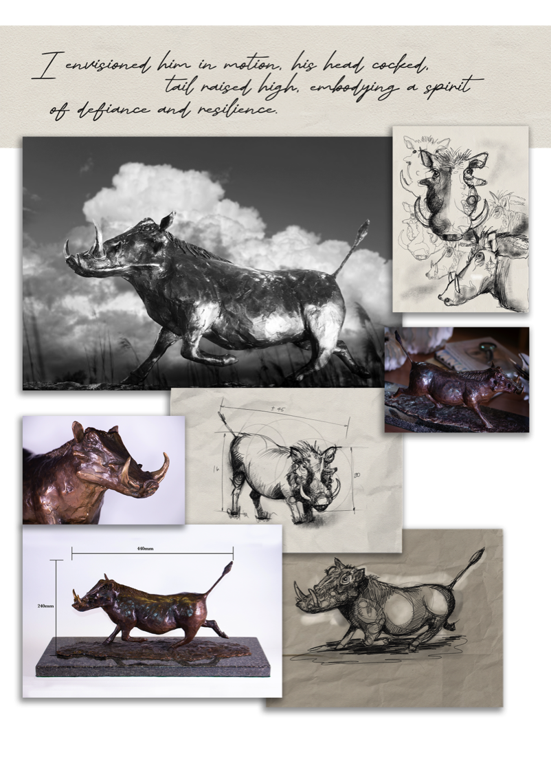 In my sculpture, I sought to capture the essence of this remarkable animal—the energy that propels him across the vast savanna. I envisioned him in motion, his head cocked, tail raised high, embodying a spirit of defiance and resilience. This stance, full of attitude, speaks to the warthog’s survival in a world that often overlooks him.